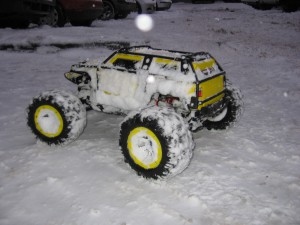 Колеса хорошо месят снег (или грязь) однако в открытие диски набивается, снег что быстро утяжеляет модель. То же происходит и с корпусом, он набирается полный снега, однако модель и после этого едет нормально.